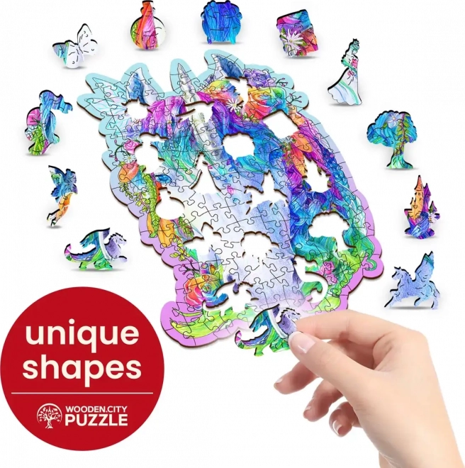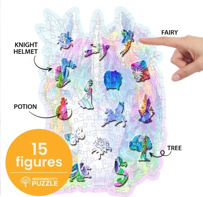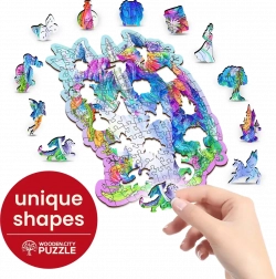 A WOODEN CITY márka stílusos fa puzzléja egyszarvú motívummal remek élményt nyújt az eredeti kirakók szerelmeseinek. A lézerrel kivágott, kiemelt részletekkel rendelkező darabok kellemesen illeszkednek, és néhányuk állat alakú, amelyeket akár önállóan is fel lehet állítani apró figurákként.