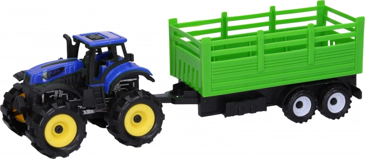 Traktor pótkocsival gyerekeknek, mérete 27,5x7x7,5 cm, lendkerekes hajtással. Kapható két színben: kék, zöld.