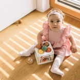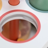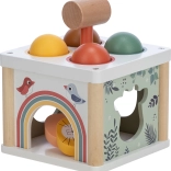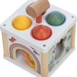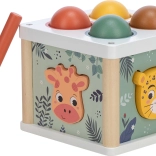 Ez a színes fa kirakós doboz szórakoztató módot kínál a gyerekeknek motoros képességeik gyakorlására. A doboz kör alakú nyílásokkal rendelkezik a labdák számára, amelyeket kalapáccsal lehet átütni a nyílásokon. Állatmotívumokkal és természeti elemekkel dekorált, ez a doboz nemcsak játék, hanem oktatási segédeszköz is a formák és színek felismeréséhez.