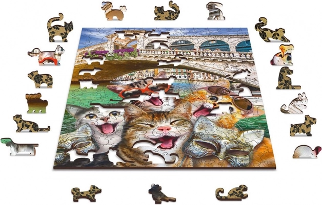 Fa puzzle Cicák Velencében 2 az 1-ben innovatív megközelítést hoz a klasszikus kirakókhoz az egyedien formázott darabjaival. Az ismert épületek, állatok vagy tárgyak alakú darabok minden kirakáshoz új kalanddimenziót adnak. Ráadásul, a lézerrel kiemelt részletek miatt ezek a darabok apró figurákként is szolgálhatnak.