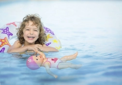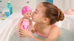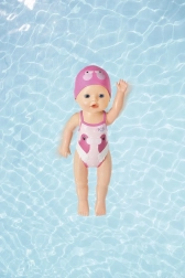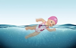 A bájos, 30 cm-es BABY born My First Swim Girl úszó baba kádban és medencében való játékra készült. Vízálló kialakításának és könnyű testéinek köszönhetően úszik és mozog a vízben, támogatja a gyermekek fantáziáját és finommotorikáját már 12 hónapos kortól. A színes fürdőruha és sapka tökéletes társsá teszi a mindennapi pancsoláshoz.