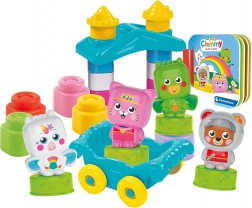 - Hintó, 12 puha Clemmy kocka, 2 torony, tető, 4 állatfigurás kocka, illusztrált karton könyvecske
