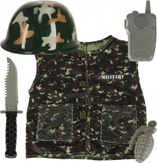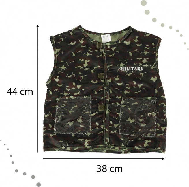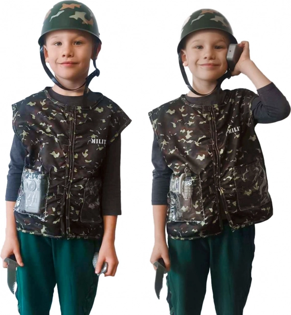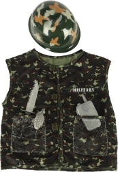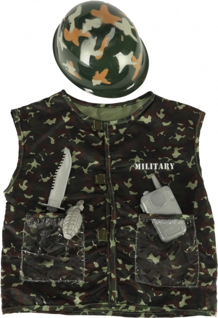 Ezzel a katonai jelmezzel gyermeke igazi katonának érezheti magát. A jelmez álcázó mellényből és katonai sisakból áll, és úgy van tervezve, hogy a legvadabb játékokat is kibírja.