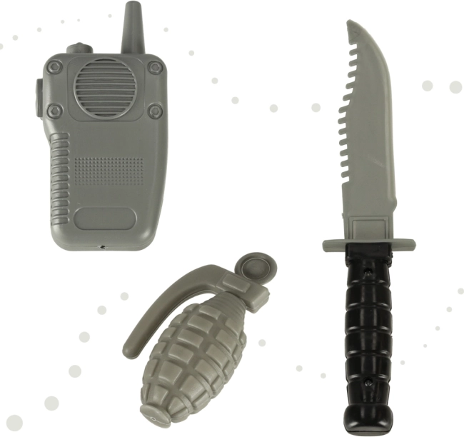 A jelmez tartalmaz egy álcázó mellényt, sisakot, műanyag kést, gránátot és rövidhullámú adóvevőt.