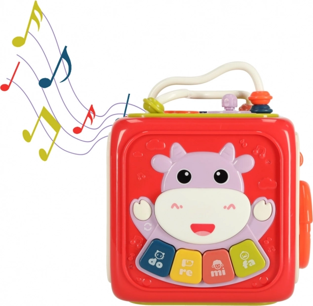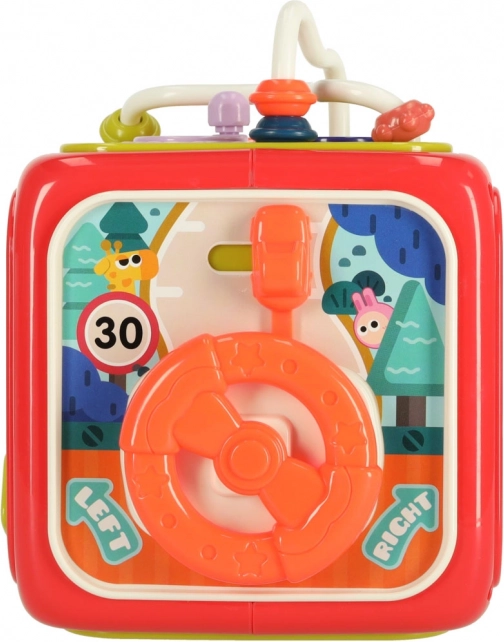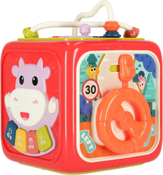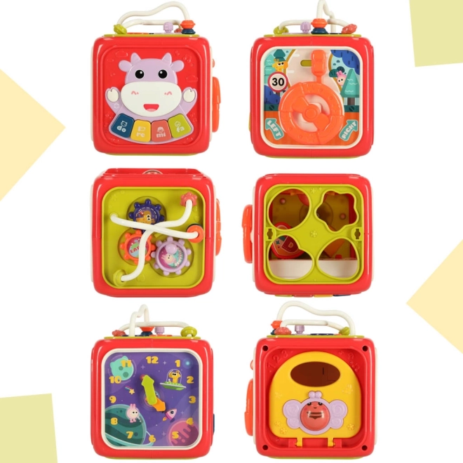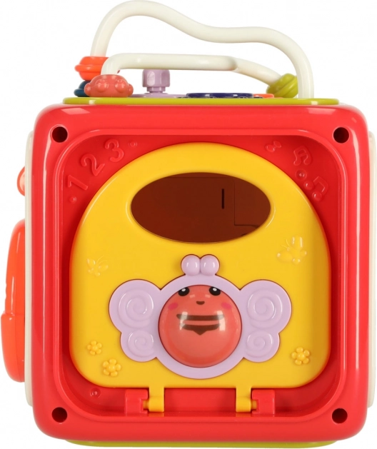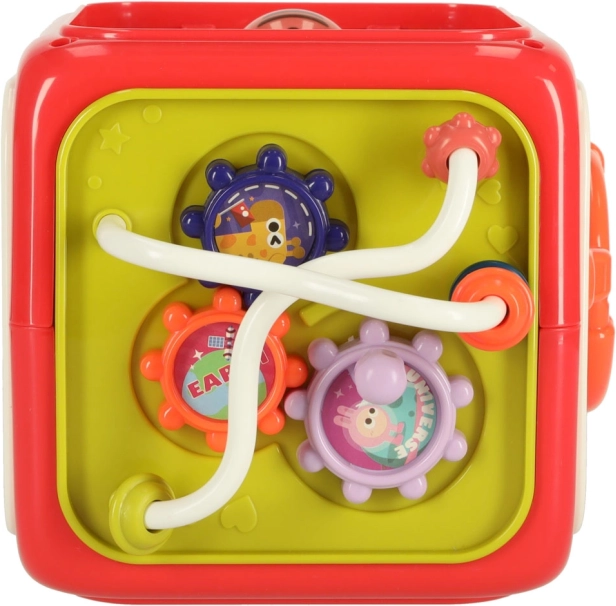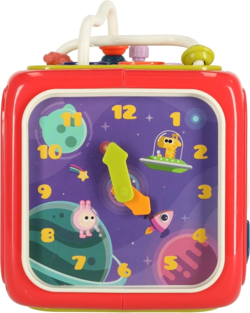 Színes és felhasználóbarát, ez a kocka az órán mozgó mutatókkal és interaktív elemekkel vonzza a gyermekek figyelmét.