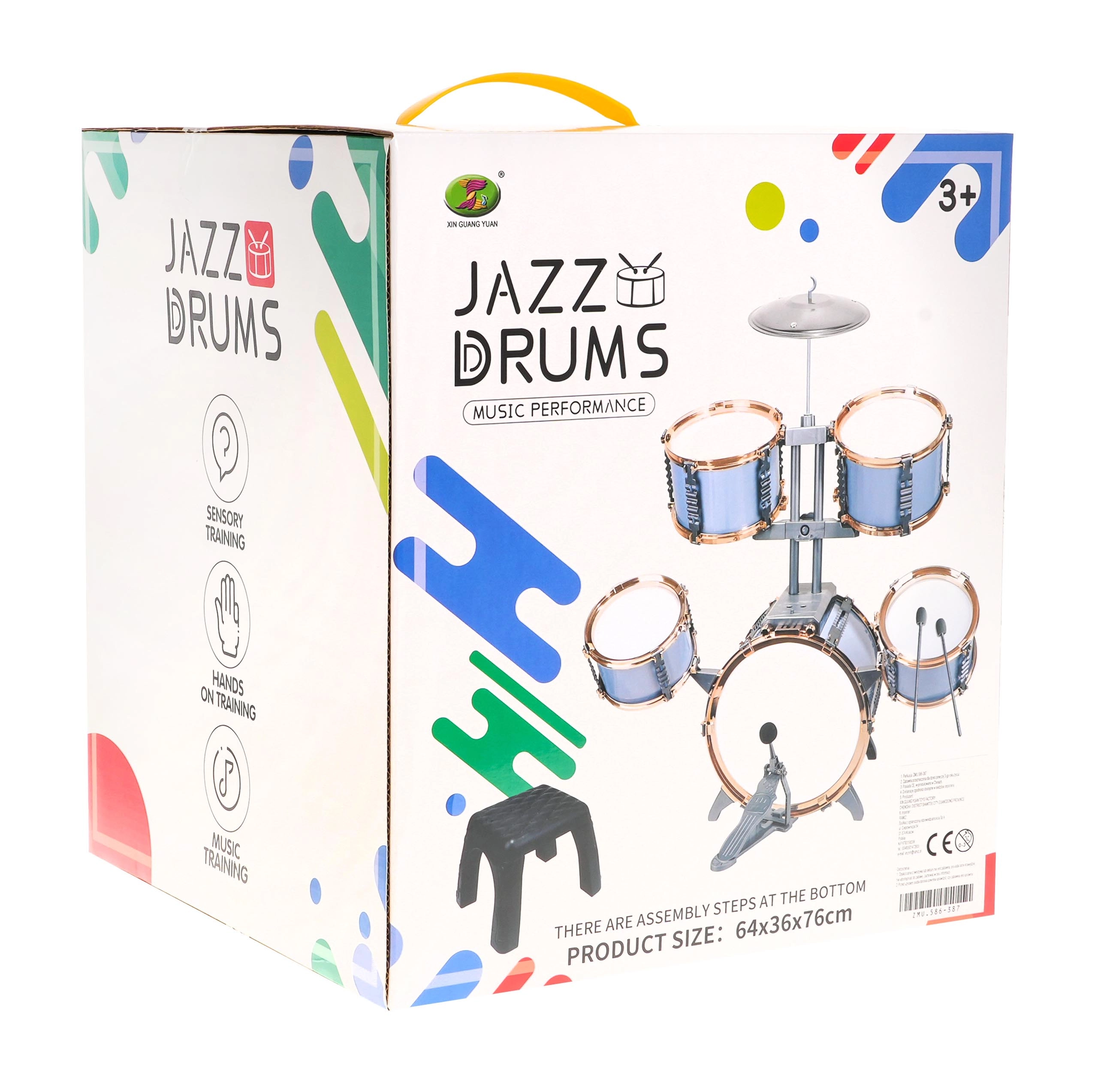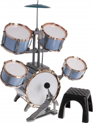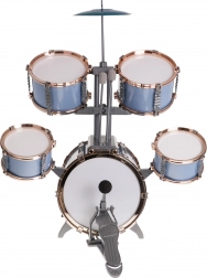 A pedállal ellátott nagydob, négy tam és a fém cintányér valódi dobfelszerelés érzetét adja a gyerekeknek.