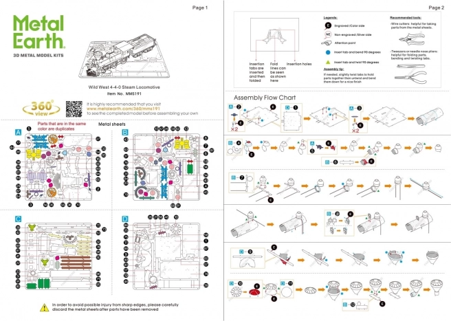 Izgalmas kihívás, élmény az összeállítás során és lenyűgöző végeredmény – ezek a METAL EARTH modellek! A Vadnyugat kollekció modellje minden Vadnyugat-rajongónak! A METAL EARTH 3D puzzle összeállítása türelmet és ügyes kezeket igényel. A végeredmény azonban bőven kárpótol a befektetett erőfeszítésért! A miniatűr replikák különösen hatásos és figyelemfelkeltő dekorációk nemcsak otthon, hanem az irodában vagy az iskolában is. 11 x 11 cm-es acél négyzetlapokból a kezei között részletgazdag, lenyűgöző modell születik. A METAL EARTH 3D puzzle autentikus megjelenését a részletes lézergravírozás biztosítja. A csomag 4 acéllapot és szerelési útmutatót tartalmaz. Szerszámok nem részei a csomagnak. MUNKAFOLYAMAT: Az egyes alkatrészeket válassza le a fém lapokról; szükség esetén használjon kis vágócsípőt (nem tartozék). Az elemeket reteszek kapcsolják össze, amelyeket egy fül (kampó) és egy nyílás alkot. A fület kis, vékony csípőfogóval hajlítsa meg (nem tartozék), és fokozatosan zárja össze az összes reteszt, míg egy rendkívül valósághű mestermű nem lesz a kezében! Ajánlott életkor: 14 éves kortól.