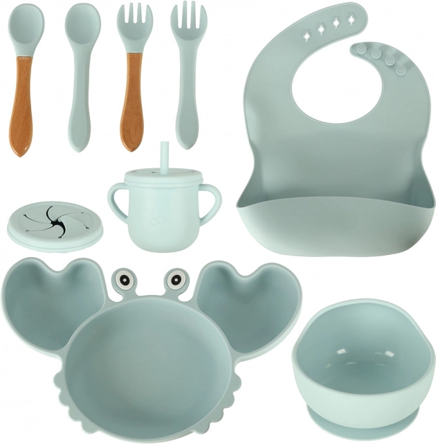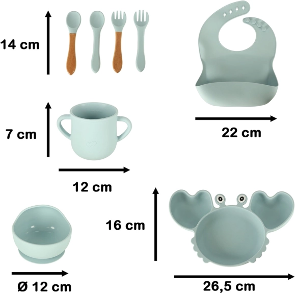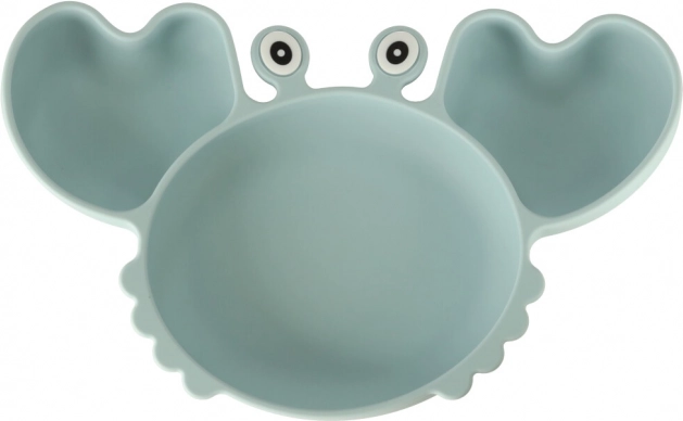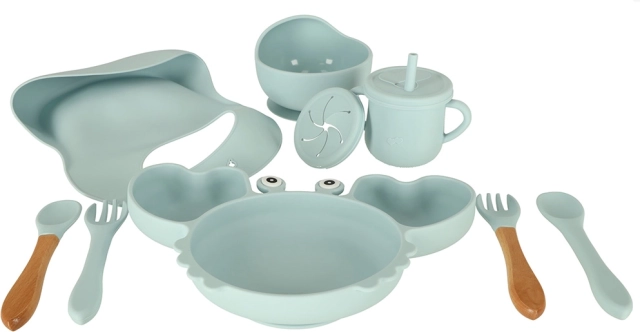 A tál és a tányér tapadókoronggal rendelkezik, hogy megakadályozza a készletek felborulását étkezés közben. A krab alakú tányér és a praktikus előke, amely elkapja az evésnél elmaradó ételdarabokat, segít rendben tartani a dolgokat.