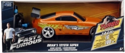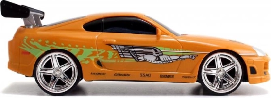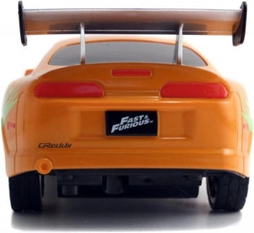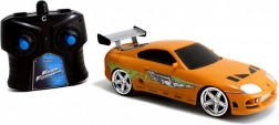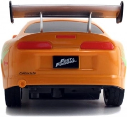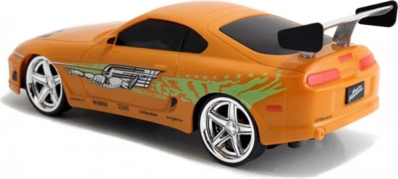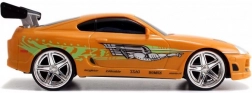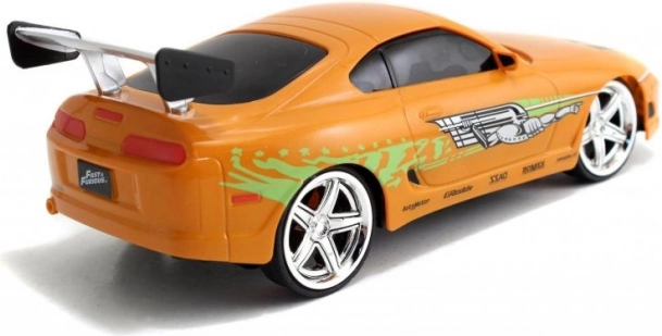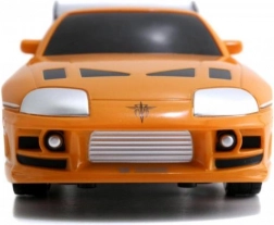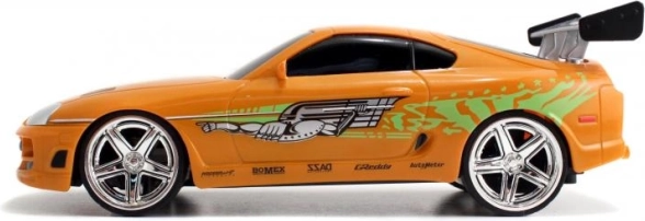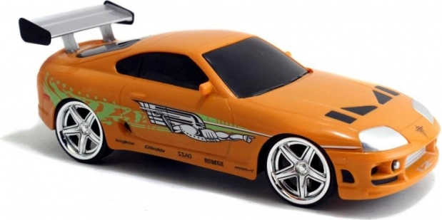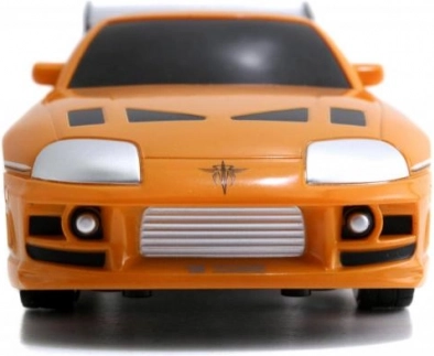 Részletgazdag, narancssárga Toyota Supra, amelyet BRIAN autója inspirált a HALÁLOS IRAMBAN-ból, autentikus matricákkal és hátsó szárnnyal.