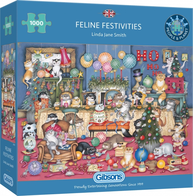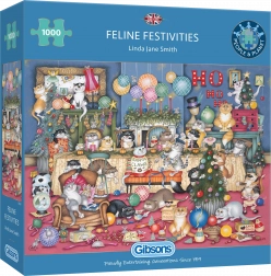 GIBSONS Puzzle Macskák ünnepei felvidít minden macskarajongót. A kirakó 1000 darabot tartalmaz, amelyek összeállítva lenyűgöző macska jelenetet alkotnak.