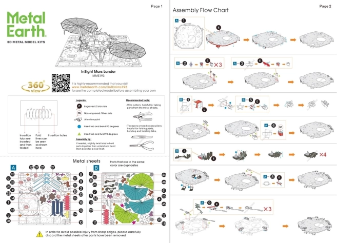 A csomag részletes útmutatót tartalmaz szerelési diagramokkal és a fémlemezek elrendezésével a modell könnyű összeállításához.