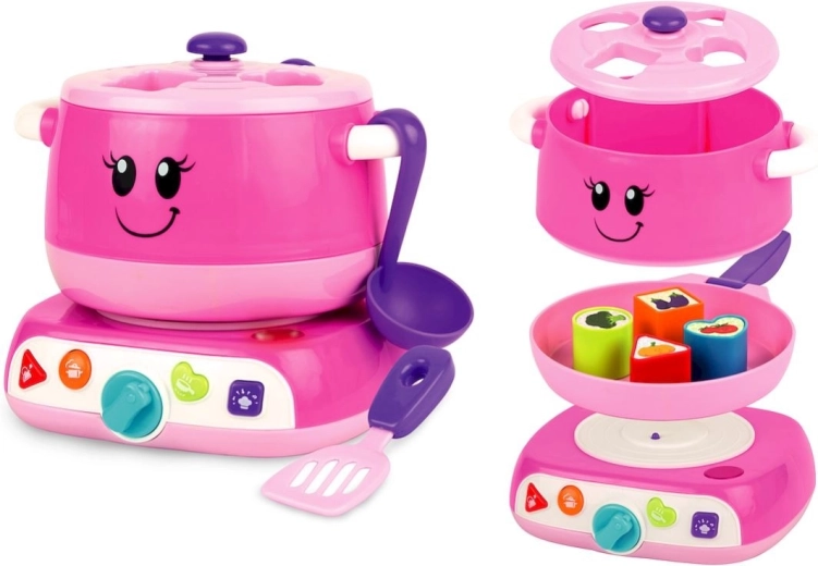 A gyerekek imádnak házasszósdit és szerepjátékot játszani. A bűvös édességfazék játék közben lengyelül beszél. A fazék és a fedele formaberakóként működik. A készlet egy mosolygós fazekat, levehető serpenyőt, lapátot és kanalat tartalmaz. Interaktív elemekkel, 4 színes gombbal és forgó kapcsolóval rendelkezik. A főzés végét fényjelző mutatja.