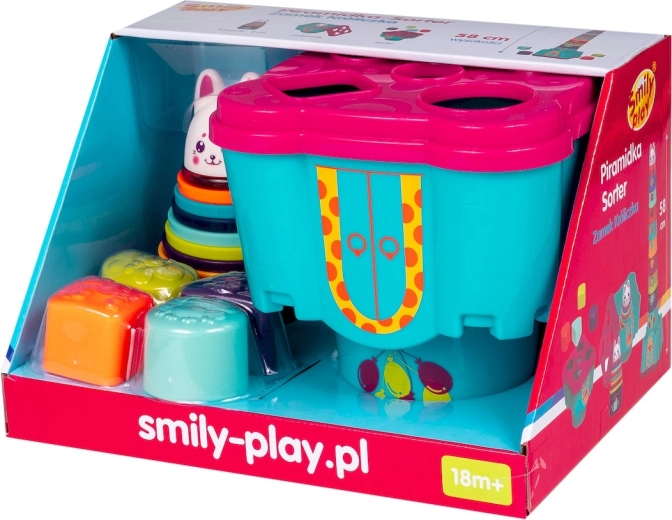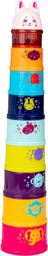 A csörgő golyócskákkal teli nyuszi a magas vár fő lakója – helyezd ezt az elemet a piramis tetejére.