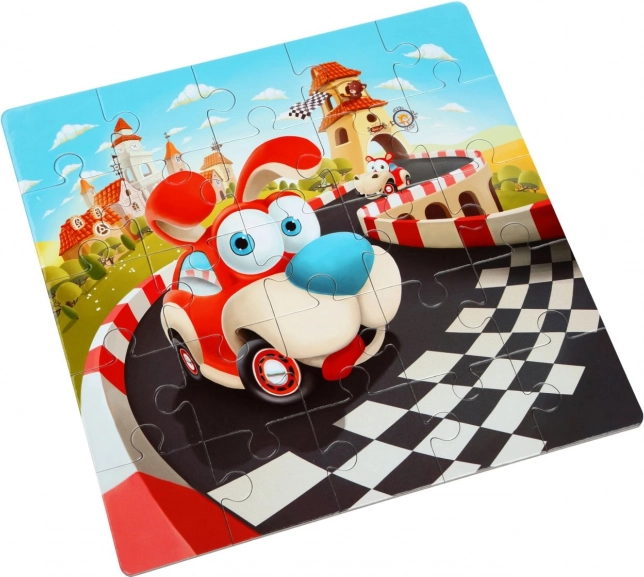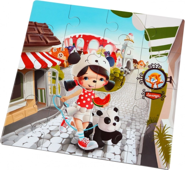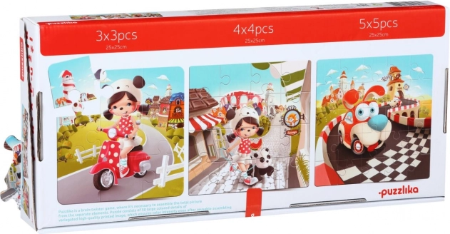 Puzzlika Boldog történetek 3 az 1-ben egy nagyszerű szórakoztató puzzle, kifejezetten kisgyermekek számára tervezve. Minden szett 50 erős és tartós darabból áll, amelyekből három különálló, 25 x 25 cm méretű képet lehet kirakni. Minden kép más-más darabszámmal rendelkezik: 3x3, 4x4 és 5x5. A puzzle gyártása minőségi többrétegű karton felhasználásával történt, fényes felülettel, ökológiailag termesztett fából. A puzzle könnyen tisztítható nedves kendővel.
