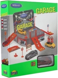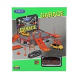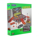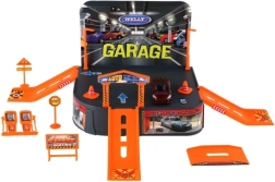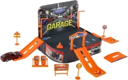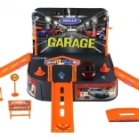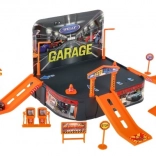 Összecsukható garázs rámpákkal, benzinkúttal és jelzőtáblákkal, amelyek valósághű parkolási és javítási élményt nyújtanak a játékosoknak.