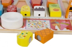 Tölcsérek, gombócok, jégkrémek, kis tálka, „csokoládé”, tálca és tábla – minden az önfeledt kombináláshoz és a formák, színek tanulásához.
