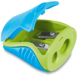 Élvezze a tiszta és kényelmes hegyezést otthon, az iskolában és útközben is. Ez a műanyag, tartályos, kétnyílású hegyező biztonságosan bent tartja a forgácsot, miközben a stabilan rögzített fedél megakadályozza a kiszóródást és a tolltartó tartalmának beszennyezését.