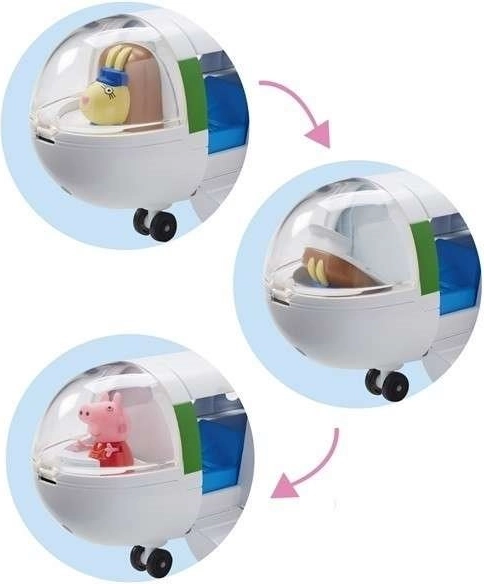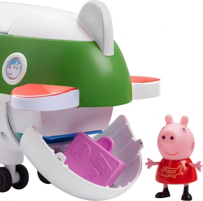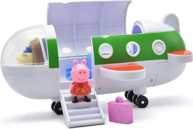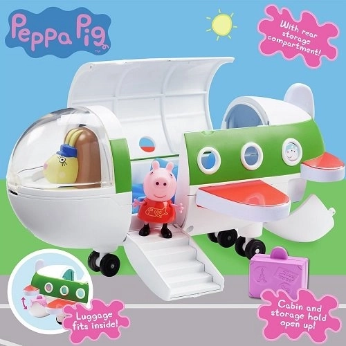 Peppa malac nyaralni indul egy tökéletes repülőgépen, amelyet egy ügyes női pilóta vezet. A repülőgépnek nyitható a teteje és lehajtható a lépcsője, így Peppa kényelmesen beszáll. Útra csomagolja a bőröndjét, és már kezdődhet is a vakáció. A repülőgépnek nyitható a pilótafülkéje is (a pilótafülke elfordítása után más is irányíthatja a gépet), valamint a gép hátsó része is kinyitható (itt lehet elhelyezni a csomagokat). A repülőgép kerekei forognak. Csomag tartalma: