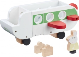 Fedezd fel a képzeletbeli játék varázsát a Peppa malac kollekció fa repülőgépével. A FSC fából készült, masszív játékot a gyerekek könnyen megfogják, a forgó kerekek sima gurulást biztosítanak, a nyitható ajtó pedig a fedélzetre hív. A készlet része Nyusziné figurája, 2 bőrönd és egy belső tér 4 ülőhellyel – ideális kreatív történetekhez és a finommotorika fejlesztéséhez.