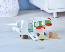 A repülő környezetbarát, FSC tanúsított fából készült, tartós színes nyomattal. Támogatja a fantázia fejlődését, a finommotorikát és az önálló játékot 2 éves kortól. A csomag tartalmazza Nyusziné figuráját, 2 bőröndöt és egy kabint 4 ülőhellyel – indulásra készen.
