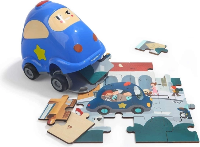 Az aranyos rendőrautó guruló kerekekkel alul nyitható fedéllel rendelkezik. Belül elfér mind a 24 fa puzzle-darab, így a darabok mindig kéznél vannak, és semmi nem vész el.