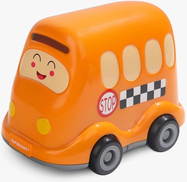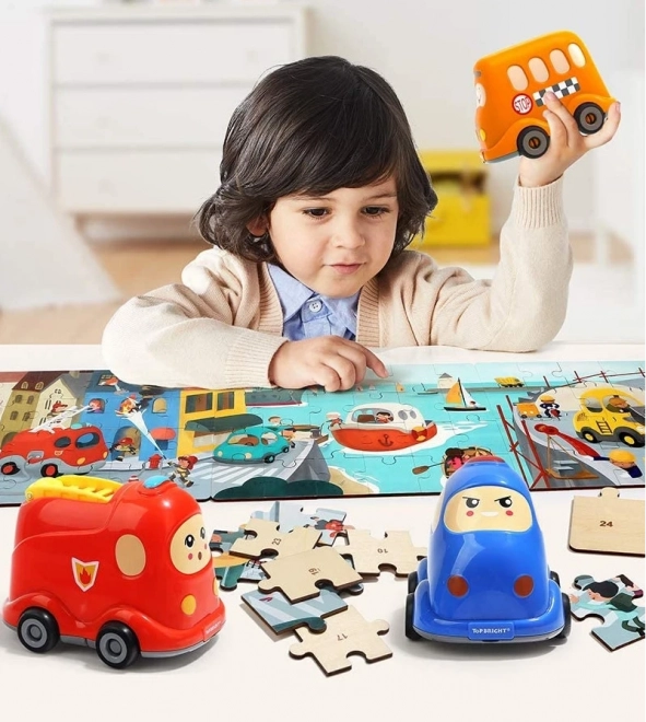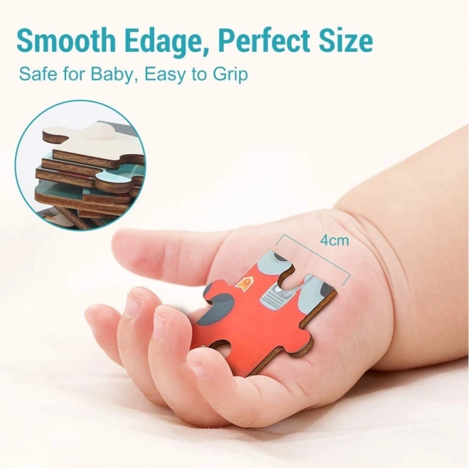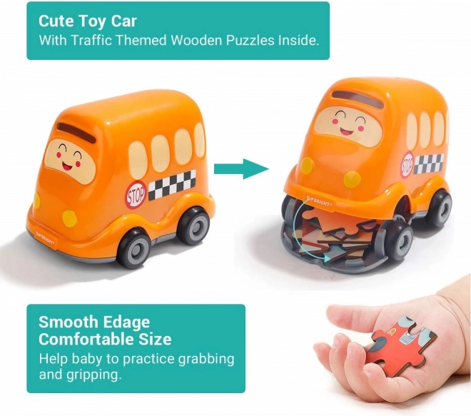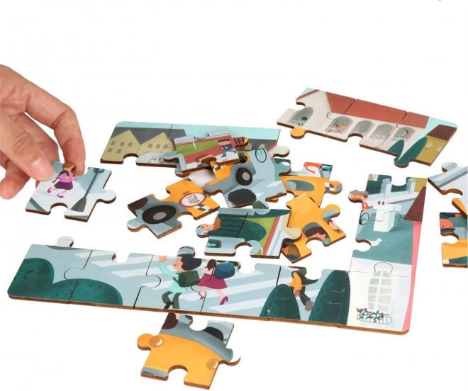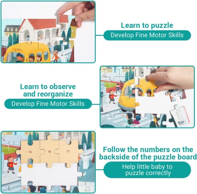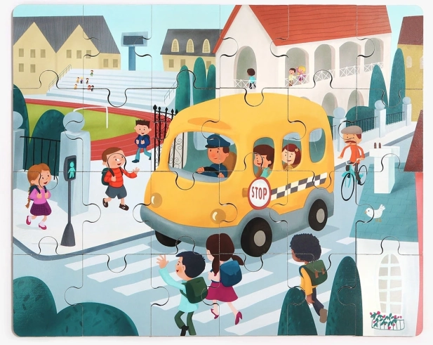 Szórakoztató és fejlesztő fa kirakó iskolabusz témával, egy aranyos, kerekeken guruló műanyag játékba rejtve. A kirakó 24 darabból áll; a hátoldalakon lévő számok megkönnyítik az összeállítást, fejlesztik a logikus gondolkodást és a finommotorikát. A műanyag busz felnyitható fedéllel rendelkezik a darabok tárolásához, és egy minisorozat része, amelyből panorámaképes kirakó állítható össze.