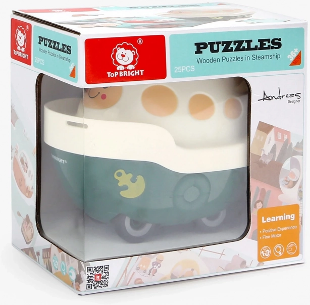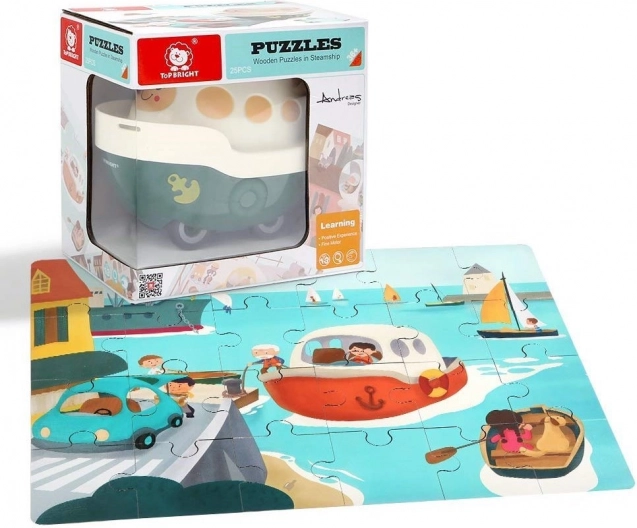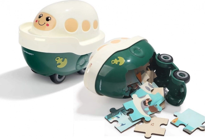 Az aranyos arcú műanyag csónak teljes értékű játék. Az alsó fedél nyitható, és elfér benne az egész kirakó vagy más apró kincsek.