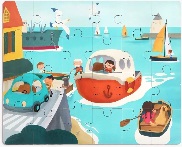 Ez az eredeti 2 az 1-ben megoldás ötvözi a járművekkel játszás élményét a kirakás örömével. A közlekedési témájú fa kirakó támogatja a koncentrációt, a finommotorikát és a logika fejlődését. A csónak önálló, kerekeken guruló játék, belül pedig biztonságos helyet rejt a darabok vagy a gyerekek apró kincseinek tárolására.