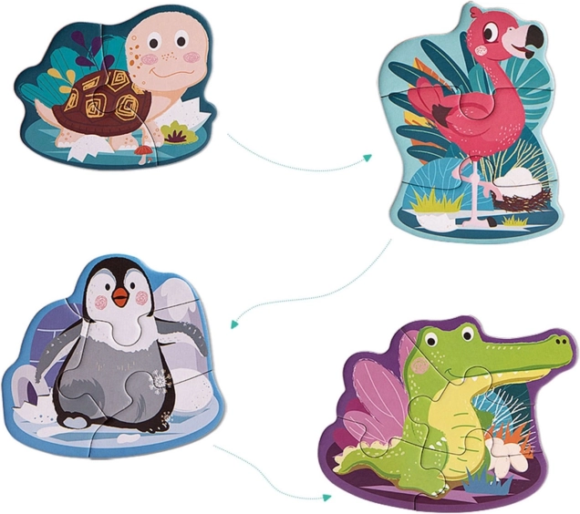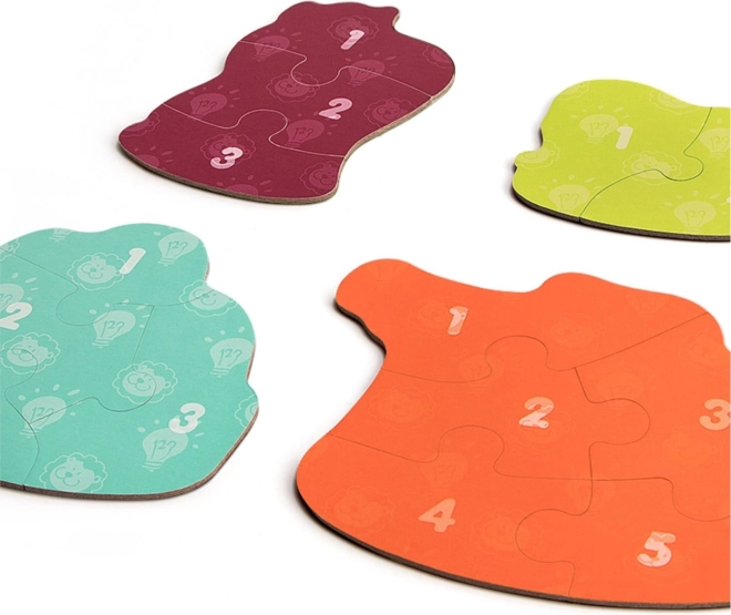 Négy kirakó fokozatosan növekvő darabszámmal erősíti a gyerekek önbizalmát, és lépésről lépésre tanít kirakózni.