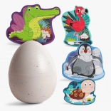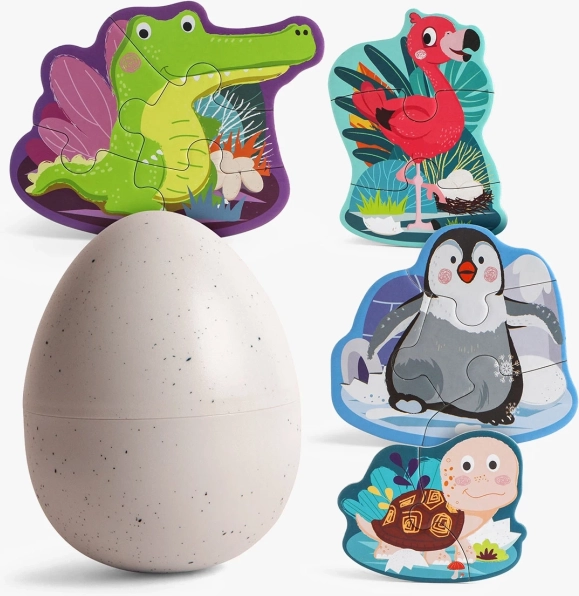 Minden kép hátoldalán azonos nyomat található, a darabok számozottak, így a gyerekek gyorsan megértik, mi hová illik. Minden a masszív műanyag tojásba kerül, amely könnyen nyílik, és rendet tart otthon és utazáskor is.