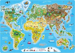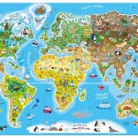 Világtérkép mint játékos tanulás – gyerek puzzle nevezetességek (Eiffel-torony, piramisok, Szabadság-szobor), természeti szépségek és az egyes területekre jellemző állatok illusztrációival. Remek közös programhoz és önálló játékhoz is, amely támogatja a térképismeretet és tájékozódást, a szókincset és a logikus gondolkodást.