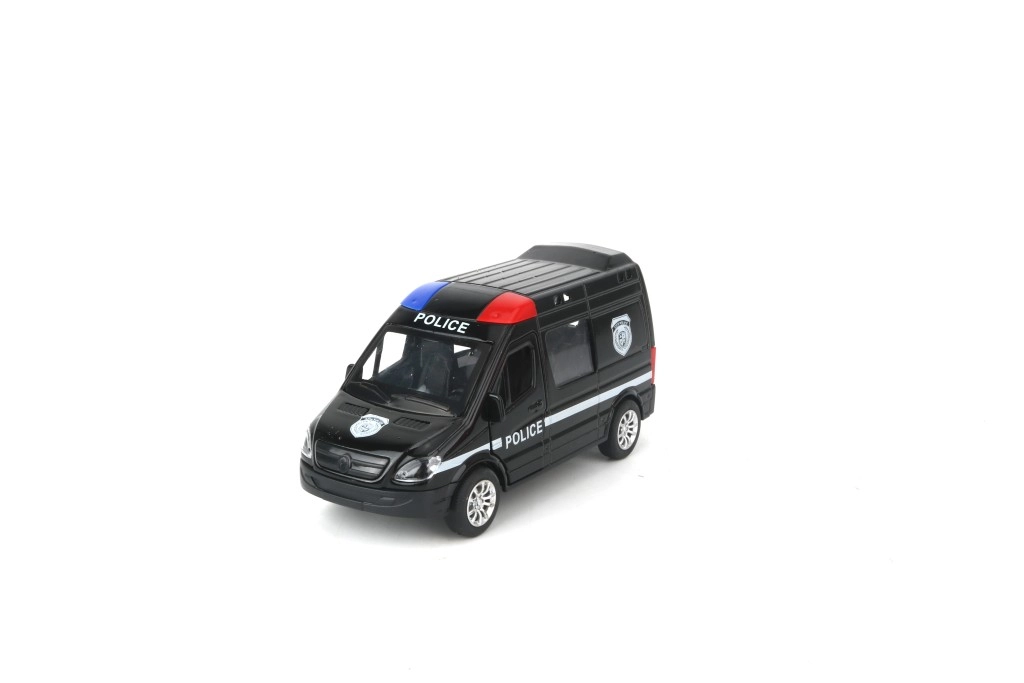 Fekete rendőrautó kék-piros szirénákkal és POLICE feliratokkal, amely akciódús játékra és üldözésekre ösztönöz – csak húzd hátra és indul.