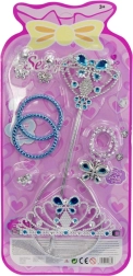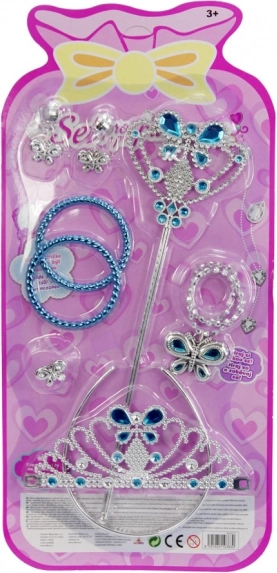 Ez a hercegnős készlet tökéletes kiegészítő a mesék kis rajongóinak. A korona, a fülbevalók és a karkötők egymáshoz illő kék színe pillanatok alatt elbűvölő megjelenést varázsol, és támogatja a kreatív szerepjátékot.
