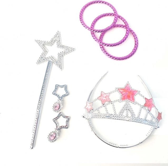 Ez a hercegnős kiegészítő szett tökéletes választás minden kis mese-rajongónak. A korona, a fülbevalók és a karkötők kombinációjának köszönhetően minden játék könnyedén királyi kalanddá válik.