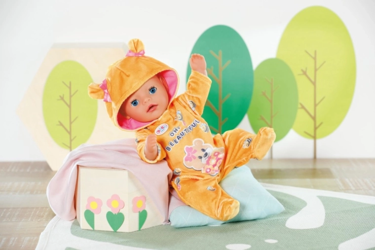 „Brumm, brumm!!!” Mi morog a gyerekszobában? A BABY born Little mézsárga overált vett fel, és nagy medvének képzeli magát. De a kapucnin lévő aranyos fülecskékkel inkább kis mackónak tűnik. A füleket rózsaszín masnik díszítik. A rugdalózó „easy fit” szabású, így az öltöztetést a legkisebb kezek is játékosan megoldják. A plüss overált díszítő képen a medvelány épp méhecskéket etet virágos finomsággal.