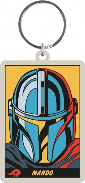 Tartós kulcstartó feltűnő sisakmotívummal és Mando felirattal – praktikus kiegészítő rajongóknak a mindennapokra.