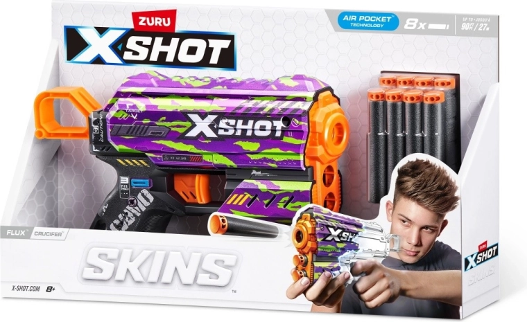 Tűnj ki a tömegből a személyre szabott SKINS megjelenéssel, és hívd ki barátaidat párbajra a könnyű, mégis erős X-Shot Skins Flux blasterrel. Az Air Pocket technológiájú nyílvesszőknek köszönhetően stabil röppályát és jobb pontosságot kapsz, miközben a pisztoly kompakt teste ideális a gyors mozgáshoz beltéren és kültéren egyaránt.