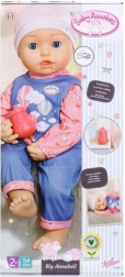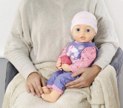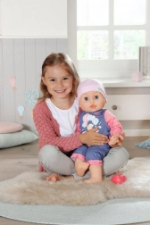 A baba egy bájos, bárány mintás rugdalózóba és rózsaszín sapkába van öltöztetve. A készlet része egy cumisüveg az etetős játékhoz. Szabványos méretének köszönhetően valódi babaruha is használható, így az átöltöztetés és a szettek kombinálása gyerekjáték.