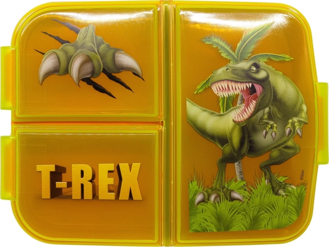 Praktikus T‑Rex dinoszaurusz mintás uzsonnás doboz a STOR-tól, amely strapabíró kivitelével, három külön rekeszével és biztonságos tárolásával ideális az iskolába, játszótérre vagy kirándulásra. A BPA-mentes anyagnak és az hivatalos licencnek köszönhetően a gyerekek imádni fogják, a szülők pedig értékelik megbízhatóságát.