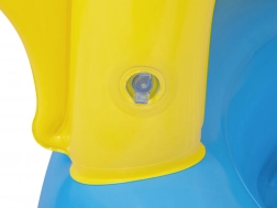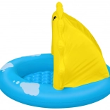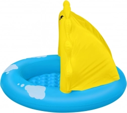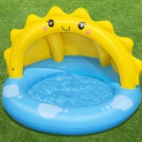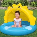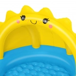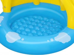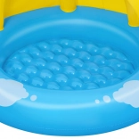 A medence vidám sárga napocskákkal és kék felhőkkel díszített, amely minden gyermeket elvarázsol.