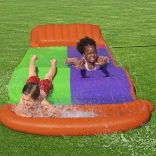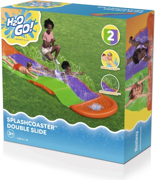 A Bestway márka SplashCoaster csúszdája szórakozást hoz a kertjébe! A 4,88 méteres kétsávos csúszda ideális versenyekhez és csoportos szórakozáshoz. A vízsugarak biztosítják a sima és gyors csúszást.