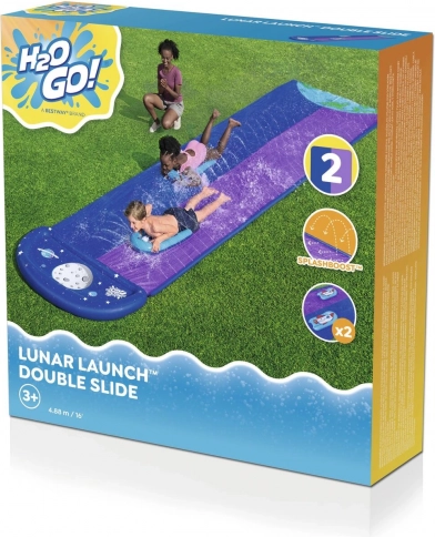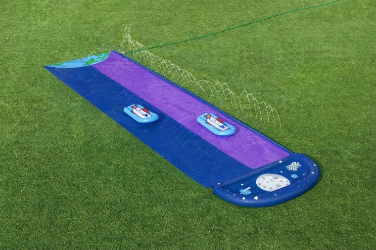 A két párhuzamos sáv versenyre hív, míg a felfújható bobok rakétamintával extra sebességet és kényelmet adnak minden csúszáshoz. A tartós PVC anyag és a puha csúszófelület növeli a komfortot és az élettartamot. Ideális gyerekzsúrokhoz és a mindennapi felfrissüléshez a forró napokon.