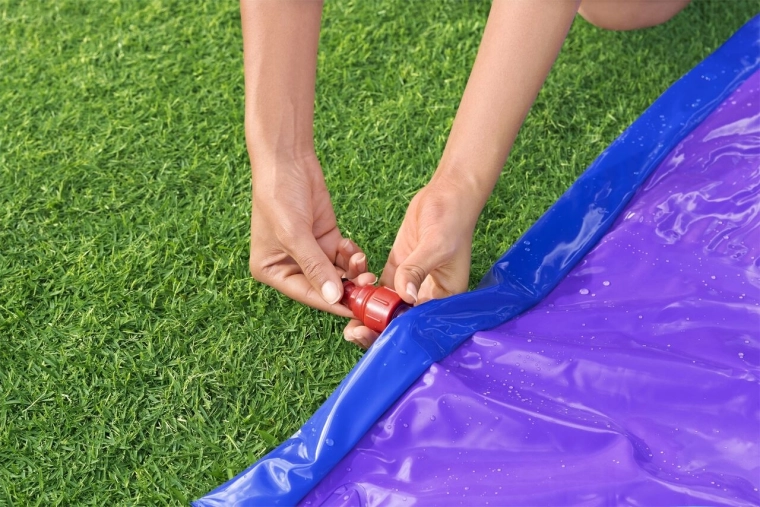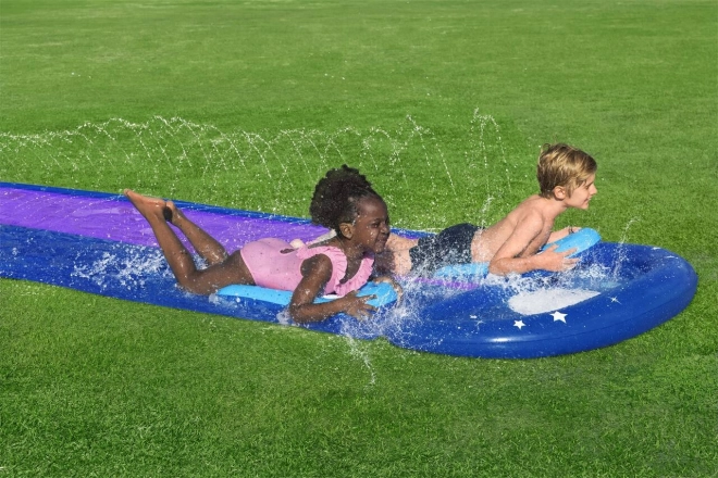 Ez a hosszú, dupla BESTWAY H2O GO! csúszda a gyerekeknek gyors, biztonságos és frissítő nyári szórakozást hoz közvetlenül a kertbe. Csak terítsd ki, rögzítsd cövekekkel és csatlakoztasd a kerti tömlőt – a oldalsó permetezők folyamatosan nedvesen tartják a felületet a sima csúszásért.