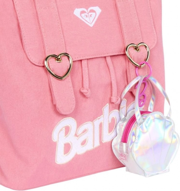Vonzó táska ragyogó anyaggal és címkéket utánzó részletekkel, amely Barbie-nak egyedi megjelenést biztosít útközben.
