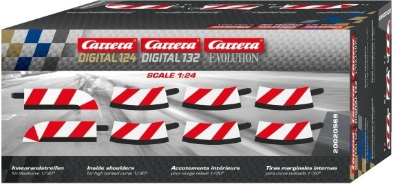 Praktikus belső szegélysor a 1/30°-os döntött kanyarhoz, amely kiszélesíti a pályát és növeli a modellek stabilitását. Kompatibilis a CARRERA EVOLUTION, DIGITAL 132 és DIGITAL 124 autópálya-rendszerekkel. A csomag 6 db elemet tartalmaz R1 sugárral az egyszerű szereléshez és a simább kanyarvételekhez.