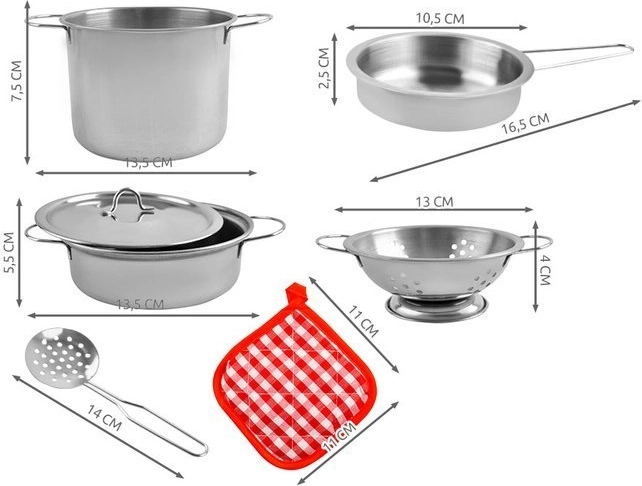 - Elegáns dizájn – Az edények klasszikus, fémes színe illik bármilyen konyhába, és izgalmas játékot nyújtanak a konyhai szerepjátékokhoz.