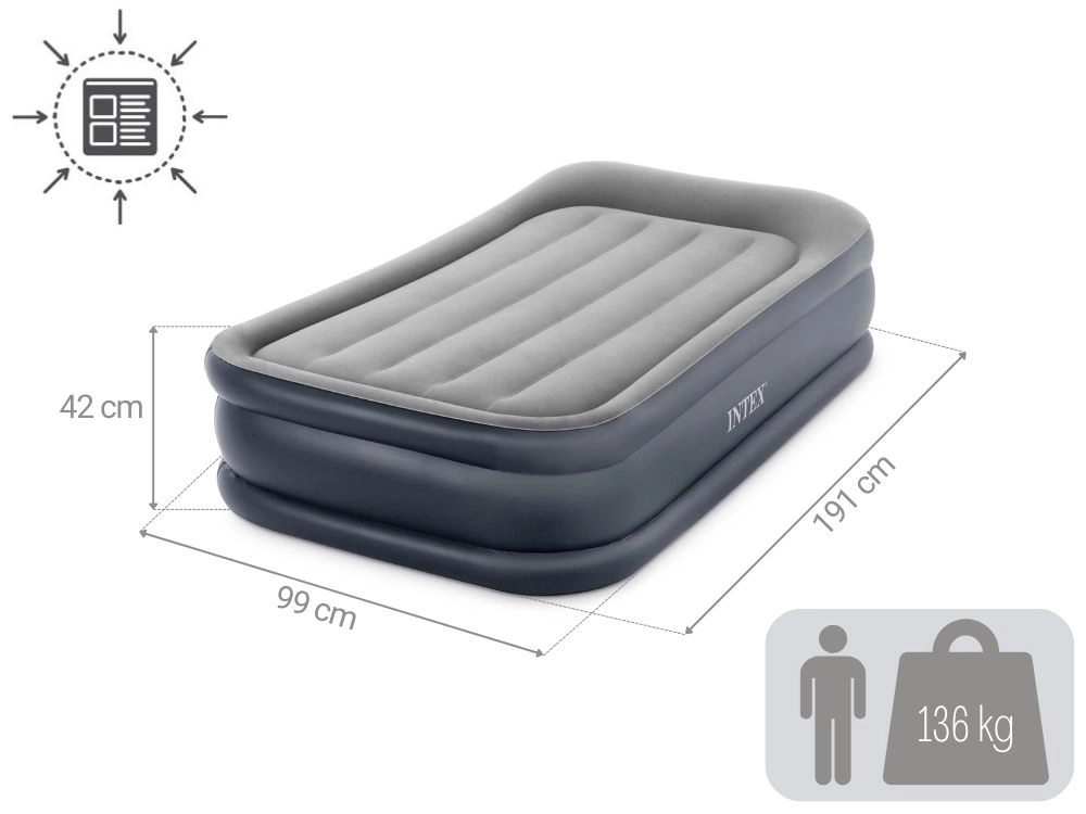 INTEX egyszemélyes felfújható ágy 191 × 99 × 42 cm mérettel, beépített elektromos pumpával a gyors felfújáshoz, selymes velúr felülettel a kényelemért és tartós Fiber‑Tech / Dura‑Beam szerkezettel a stabil tartásért. Maximális teherbírás 136 kg, a csomag tartalma hordtáska és javítófolt.