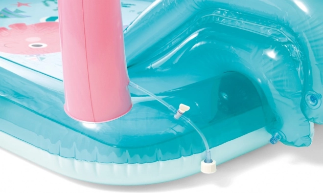 A Felfújható vízi játszóközpont Polip a kertet kis tengeri birodalommá varázsolja. A kerti tömlőre köthető, integrált permet finom vízhatást kelt, amit a gyerekek imádnak, a csúszda pedig biztonságos csobbanással egészíti ki a mókát. Az extra felfújható alátét növeli az ülés és a játék kényelmét.