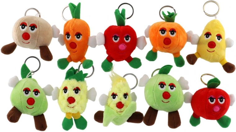 Vidám minifigurák kedvelt termések formájában – alma, répa, ananász és mások – színes akcentust visznek a mindennapi hordásba. A pihe-puha plüss kellemes tapintású, míg a fém karika megkönnyíti a megbízható rögzítést kulcsokra, cipzárra, hátizsákra vagy kézitáskára.