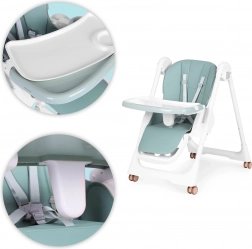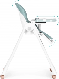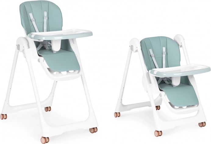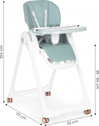 A megemelt peremű, pohártartós dupla tálca csökkenti a rendetlenséget, a felső réteg pedig étkezés után egyszerűen leemelhető és elmosható. Az ökobőr huzat nedves ruhával könnyen tisztítható. A gumifutófelületű kerekek megkönnyítik az áthelyezést a padló megkarcolása nélkül, a beépített kerékrögzítők pedig stabilan rögzítik a széket.